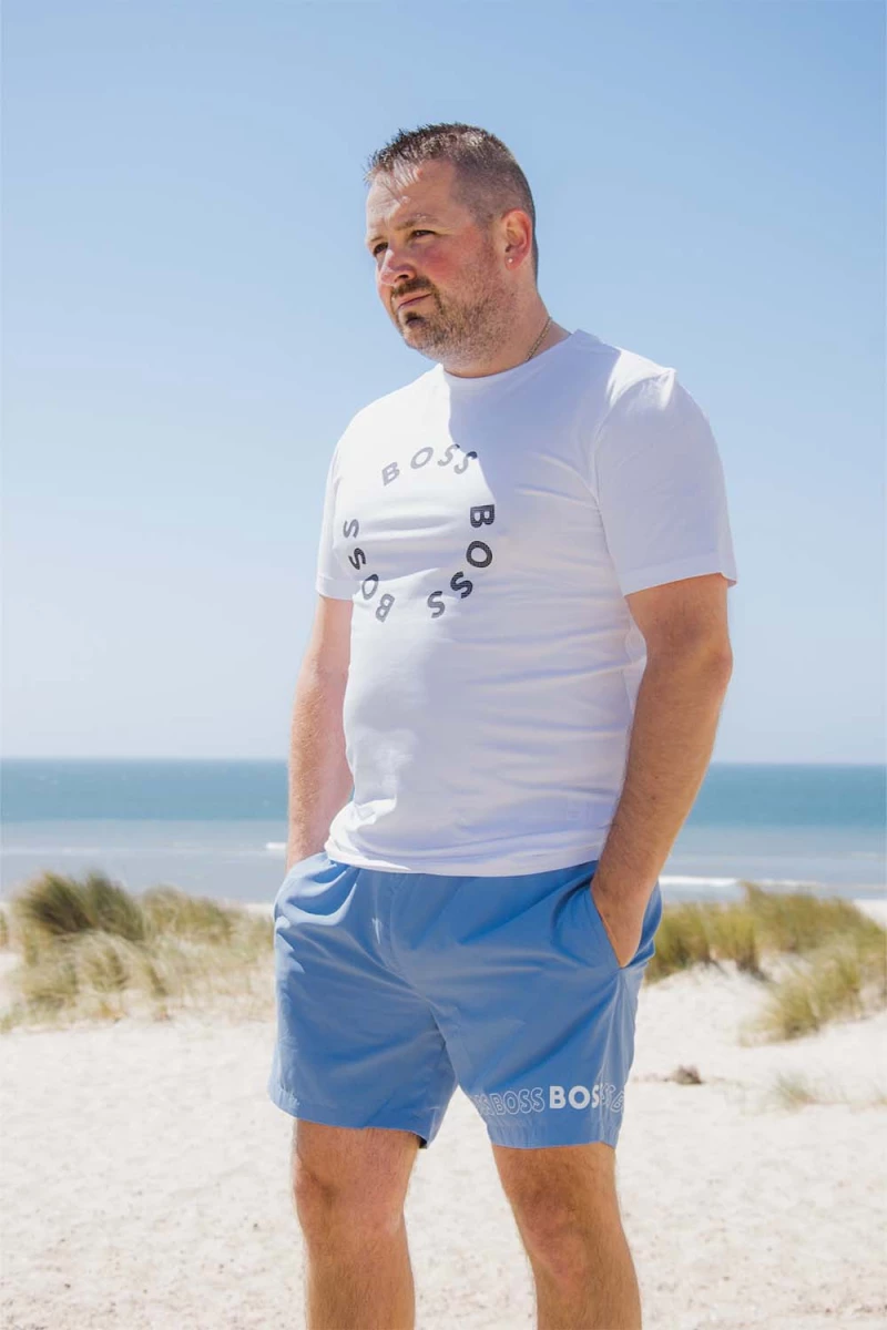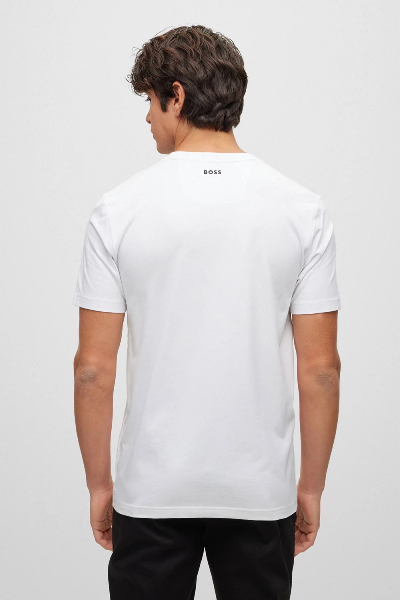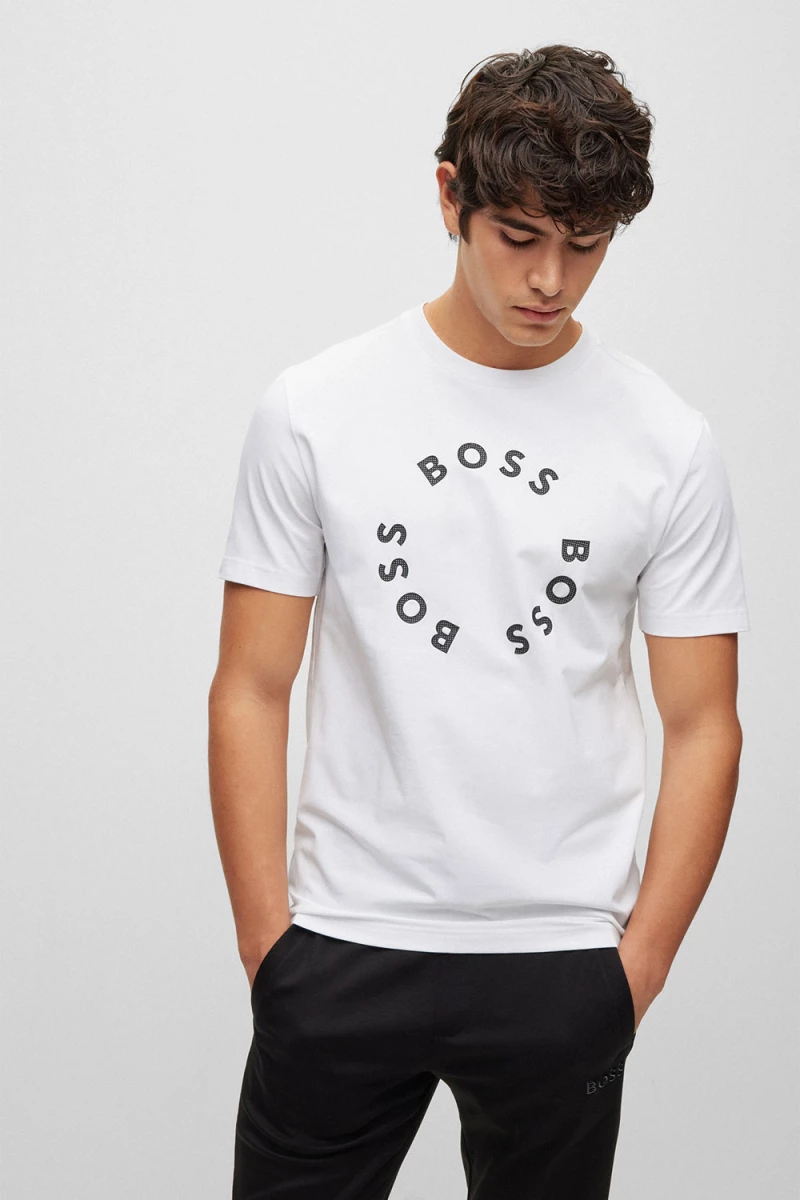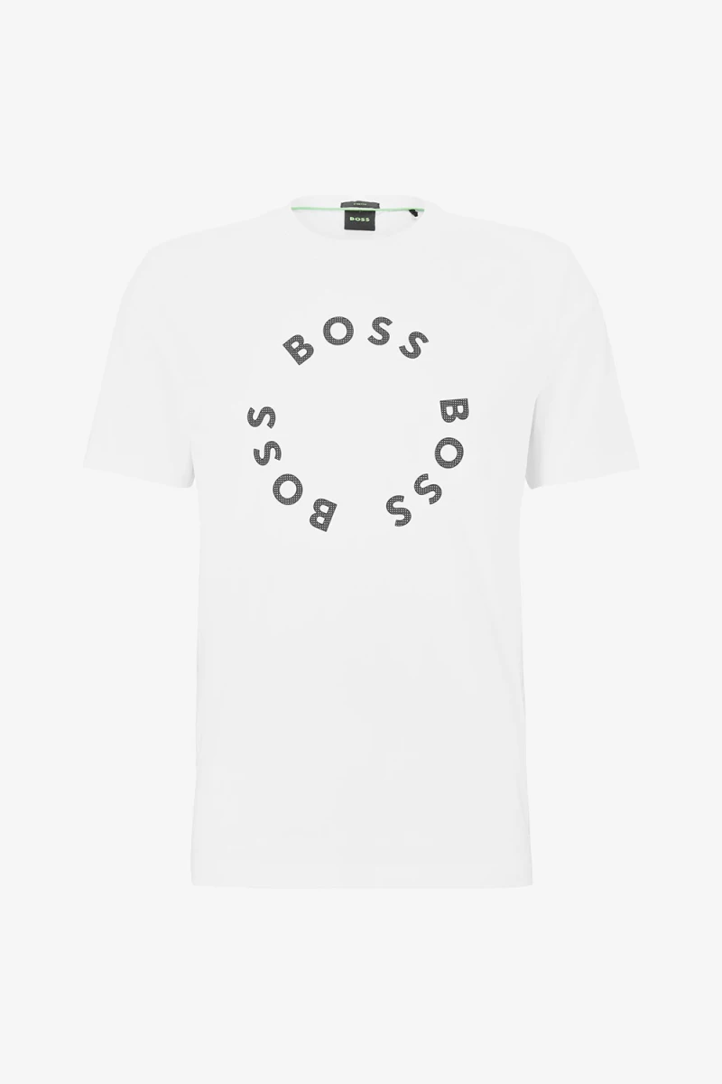 Deze Tee T-shirt van BOSS is een stretchjersey van Boss Menswear. Het is een regular fit en is gemaakt van katoen en elastaan. Het T-shirt heeft een standaardlengte. Het shirt heeft een groot boss logo op de voorzijde. Met dit shirt ben je helemaal klaar voor de zomer!
