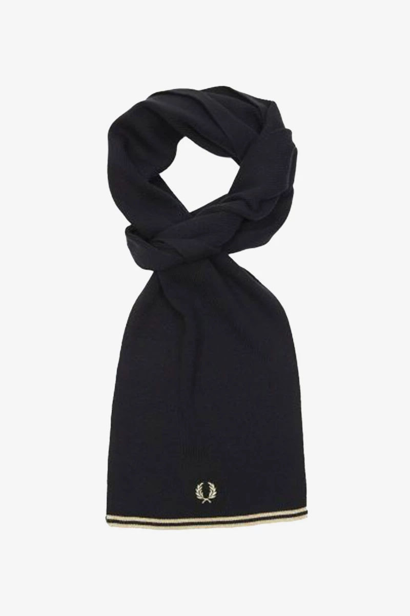 Gebreide sjaal gemaakt van 52% merino wol en 48% katoen. Voorzien van gekleurde details op de onderkant van de sjaal. De sjaal is afgemaakt met een geborduurd logo van Fred Perry. De sjaal is zacht en comfortabel.